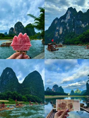 - Khởi hành đến bến Phúc Lợi, trải nghiệm thuyền tre 4 người tham quan sông Ly Giang. Sông Ly Giang là dòng sông mẹ của Quế Lâm, khu danh thắng trọng điểm cấp quốc gia, Di sản thiên nhiên thế giới và bình chọn là một trong mười kỳ quan sông nước đẹp nhất toàn cầu, bè tre như bút, sông Ly như giấy, sơn thủy là mực, vẽ nên một cuộn tranh thủy mặc nghìn năm không phai màu.